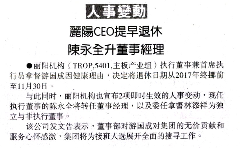 Tropicana Corp. Bhd. (TROP, 5401, main market, property) announced its’s Chief Executive Officer (CEO) Datuk Yau Kok Seng is retiring on 30 November 2017 due to health reasons.
